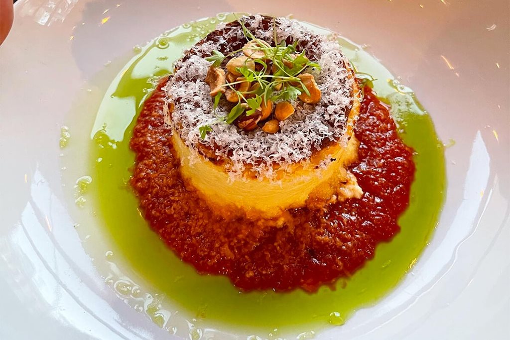 Pony Dining are the pioneers of woodfired cooking in Sydney. Almost everything they serve in their Kendall Lane venue is kissed by fire, including the phenomenal Twice Cooked Gruyere Souffle. This rich, fluffy masterpiece is served with wood roasted capsicum sauce and hazelnuts.